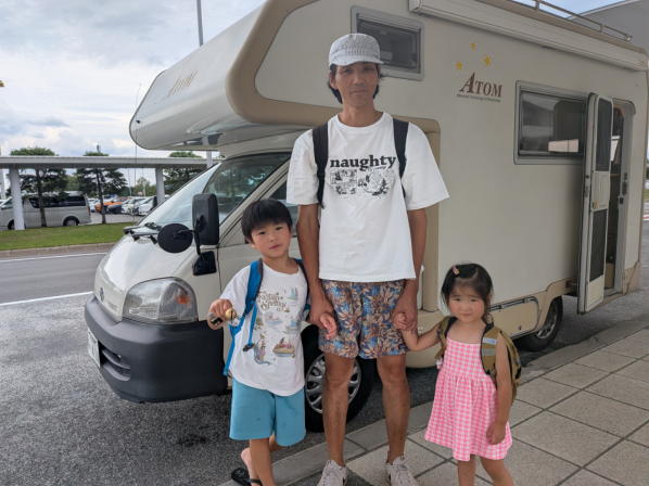 キャンピングカー旅 2025/08/07 千葉県からお越しのお客様♬旭山動物園~富良野~道東方面を1週間かけて家族4人で旅行されました!記念写真は奥様は恥ずかしいということで、お父さんとお子様の3人で撮らせて頂きました。